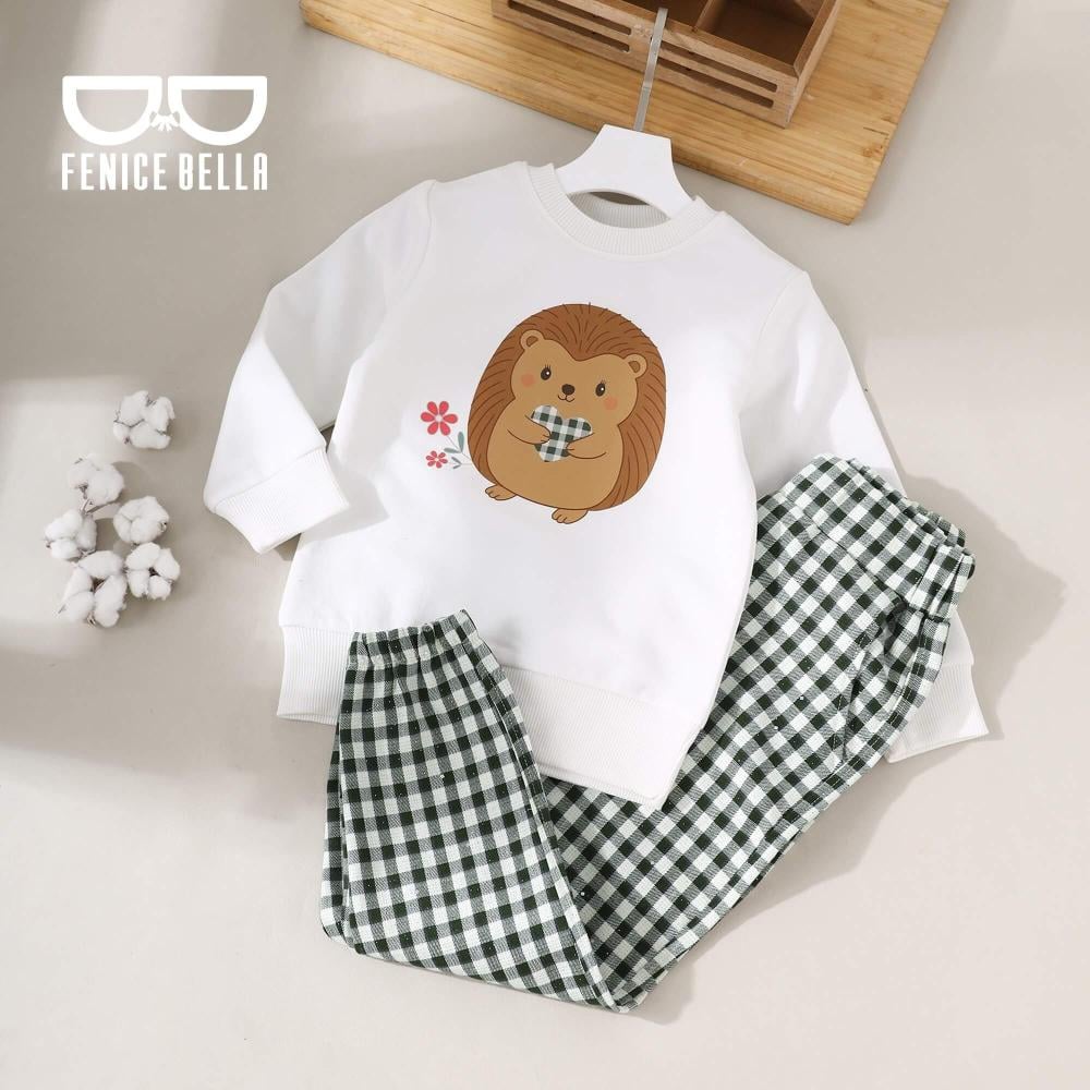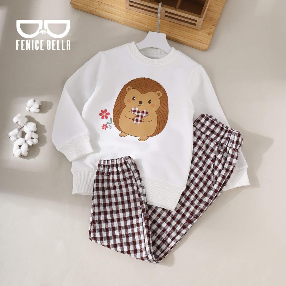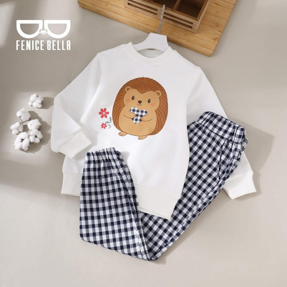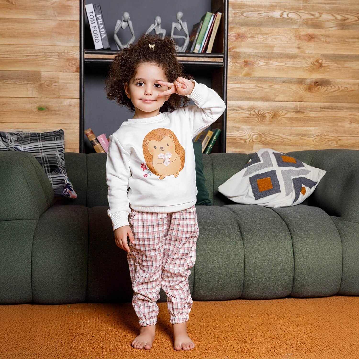 بيجامة بناتي الكنزة ميلتون  مطبوع  قنفذ وزهرة  والبنطال نسيج كارو